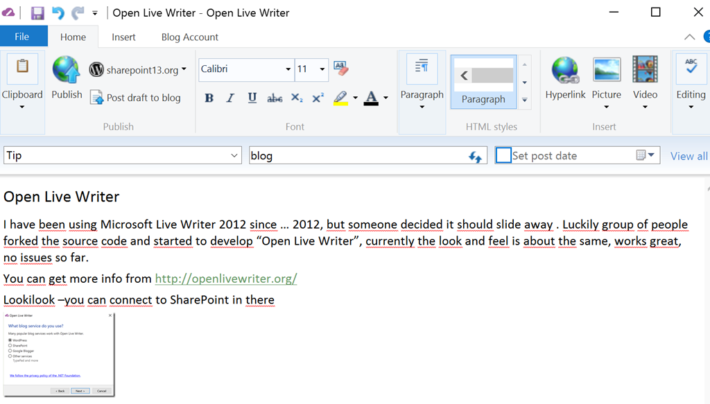 I have been using Microsoft Live Writer 2012 since … 2012, but someone decided it should slide away . Luckily group of people forked the source code and started to develop “Open Live Writer”, currently the look and feel is about the same, works great, no issues so far.