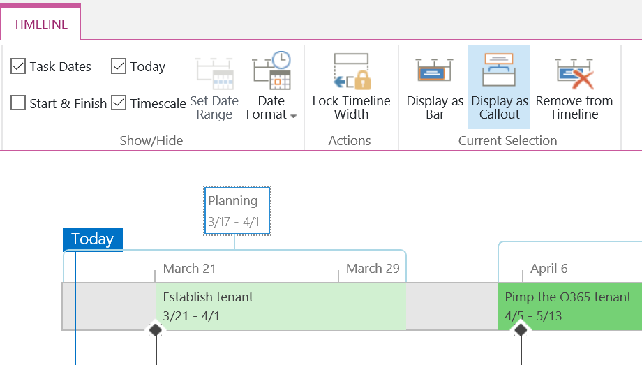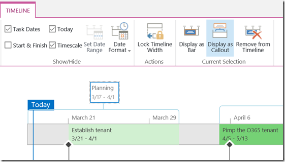 2: To display phases as Callouts you just add tasks named those phases eg “Planning”, assigned to nobody, and add it to the timeline, mark it and select Display as Callout.